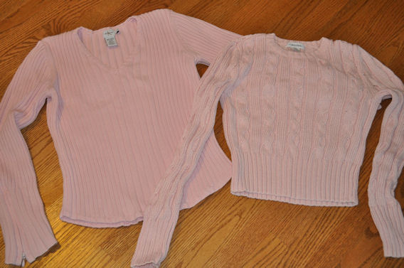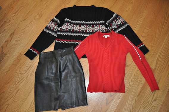 Peggy’s wool sweater, Tommy Hilfiger red cotton sweater, and black leather skirt. |