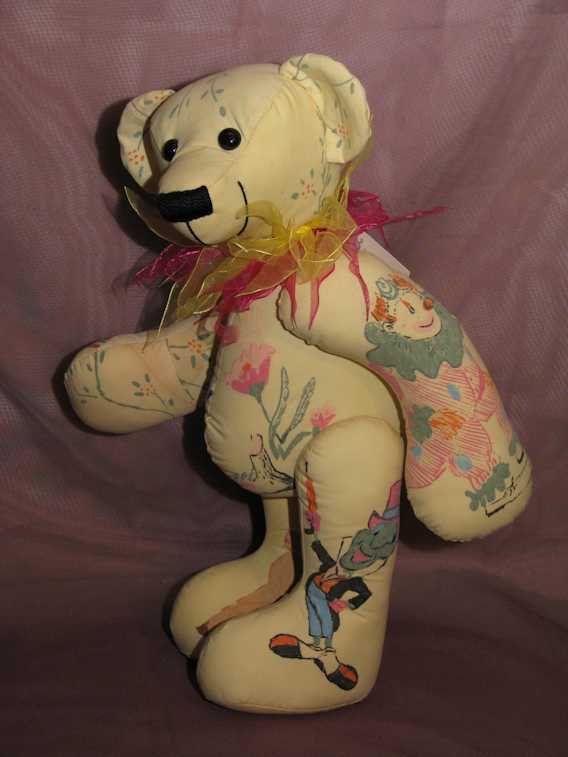 Doodles is a memory bear created from fabric painted by Dolores with Artex paints. Doodles is fully jointed and stuffed with polyester fiber. The bear has an embroidered nose and safety eyes. Doodles is 15 inches tall.
