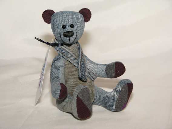 Bailey is a special teddy bear made from Dale's paint splattered jeans (head, body, arms, legs, bow), March 2012 |