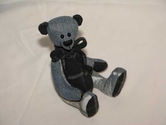 Smoke is a special teddy bear made from Dale's paint splattered jeans and PJ bottoms. The teddy is fully jointed and stuffed with polyester fiber. Smoke has safety eyes, an embroidered nose and is 7 inches tall.