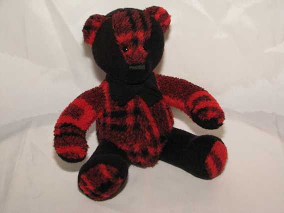 Major is one of four special teddy bears made from Marian’s red and black fleece jacket. The teddy has safety eyes, an embroidered nose and is stuffed with polyester fiber. Major is 12 inches tall and wears a bow made from one of Marian’s t-shirts.