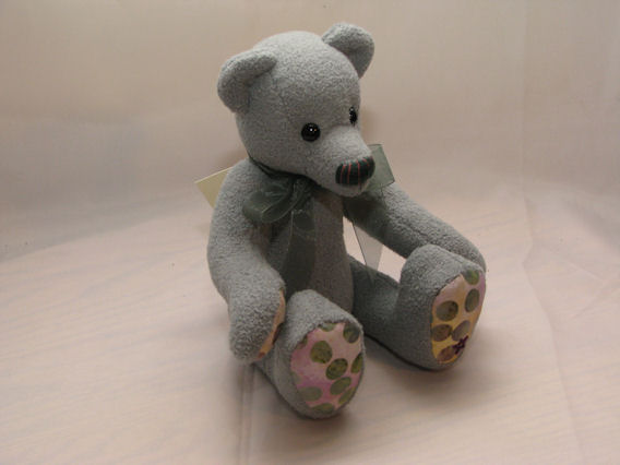 Binx is a sweet teddy made of light teal short plush. He is fully jointed and stuffed with poly fiber. He has patterned paw pads, safety eyes and an embroidered nose. Binx is 11 inches tall.