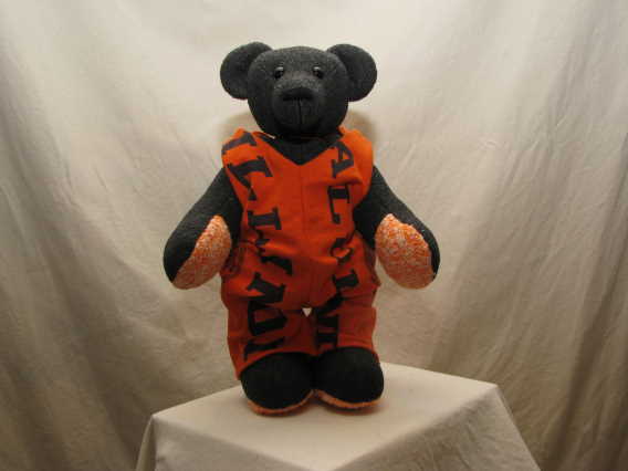 In memory of Stephanie Lesiecki Bravery Bear wears overalls, made from Steph's Illinois Alumni t-shirts. Bravery Bear is fully jointed and is 12 inches tall.
