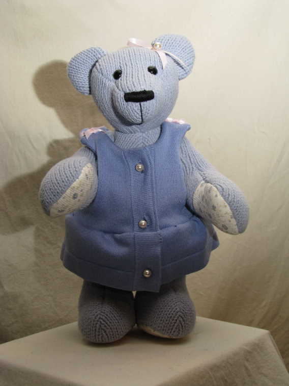In memory of Stephanie Lesiecki Grace is made from Steph's GAP pullover sweater, with paw pads made from her floral tank top. Grace wears a dress made from Steph's Ann Taylor cardigan sweater. Grace is fully jointed and is 12 inches tall.