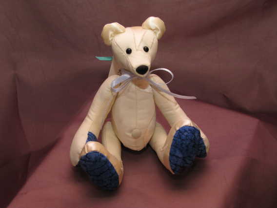 These are my belly button girls! They are made from Mrs Oehmke's wedding gown. The are fully jointed with fabric paw pads, safety eyes, and a flocked nose. They are stuffed with polyester fiber. The belly button girls are 8 inches tall.