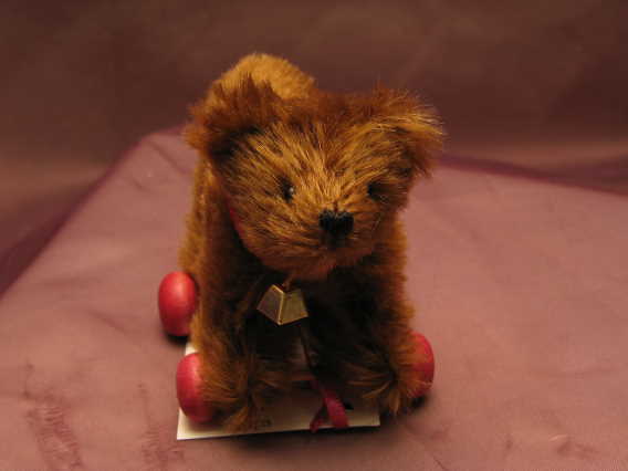 These are bears on wheels! They are made of mohair with glass eyes and a tiny embroidered nose. The bears on wheels are 4 inches long.