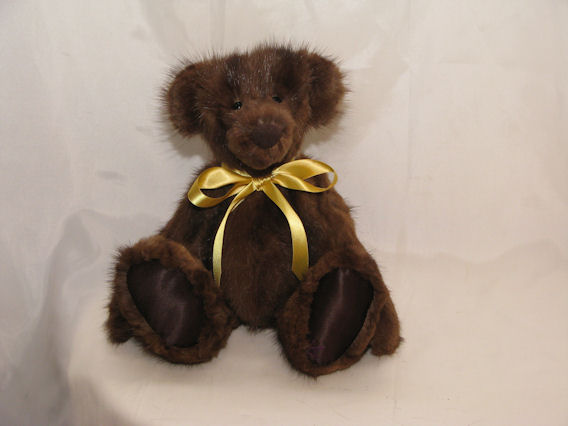 Gabby is a special teddy bear made from one of Ann's full length muskrat coats. The teddy is fully jointed and stuffed with polyester fiber. Gabby has safety eyes, a fabric covered nose and is 15 inches tall.