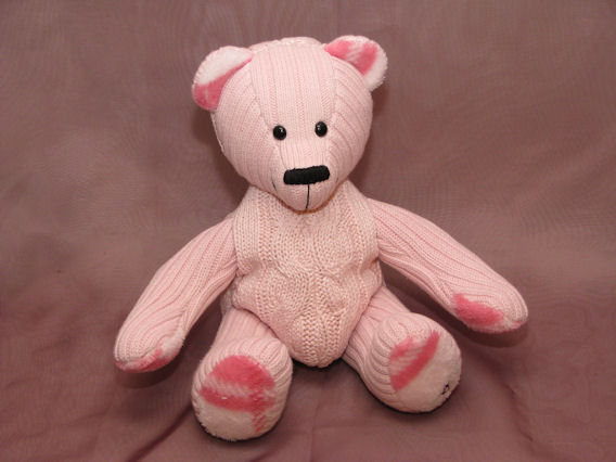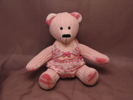 Piglet is a special teddy bear made from two of Peggy’s pink cotton sweaters.