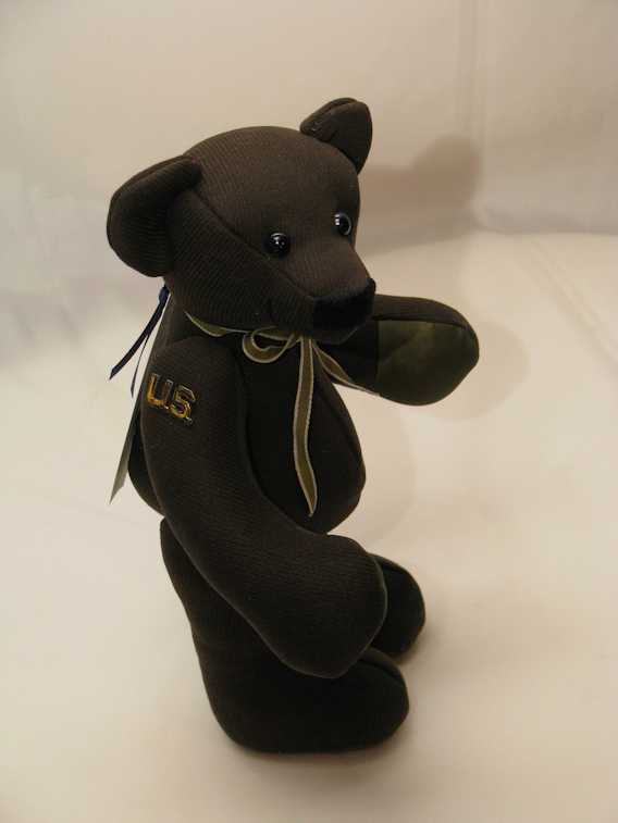 Hubby Cubby is a memory teddy bear made from Al’s United States Army Air Corps uniform. The bear’s paw pads are made from the jacket’s lining. Hubby Cubby has safety eyes, an embroidered nose and is stuffed with polyester fiber. It wears a U.S. pin and button from the jacket. Hubby Cubby is 10 inches tall.