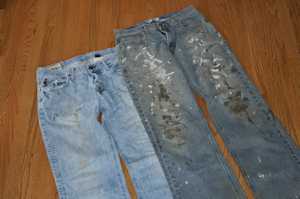These bears are special bears made from Dale's paint splattered jeans, Nike sweatshirt, striped sweater, work vest and PJ bottoms.