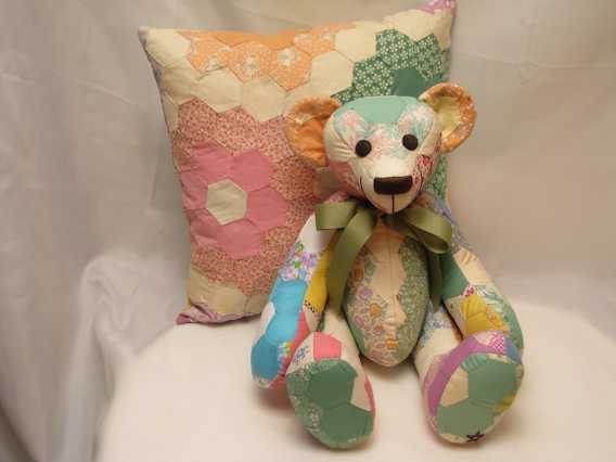 Misfit is a memory bear created from a quilt top pieced by Hulda and her sewing club. The quilt top was never finished, but was passed along through the family. Misfit is fully jointed and stuffed with polyester fiber. The bear has an embroidered nose and sued covered safety eyes. Misfit is 15 inches tall. A pillow was also made from the quilt top.