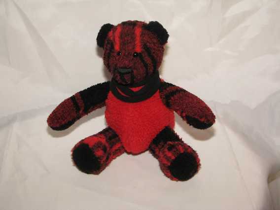 GV is one of four special teddy bears made from Marian’s red and black fleece jacket. The teddy has safety eyes, an embroidered nose and is stuffed with polyester fiber. GV is 12 inches tall and wears a scarf made from one of Marian’s t-shirts.