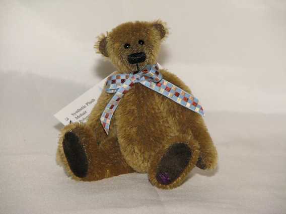 Clancy is made of mohair and has suede paw pads. He is fully jointed with glass eyes and an embroidered nose. He is stuffed with polyester fiber. Clancy is 6 inches tall.