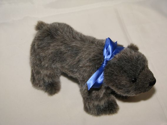 Shamus is made of brown frosted pluch and has suede paw pads. He has safety eyes and an embroidered nose. He is stuffed with polyester fiber. Shamus is 10 inches tall.