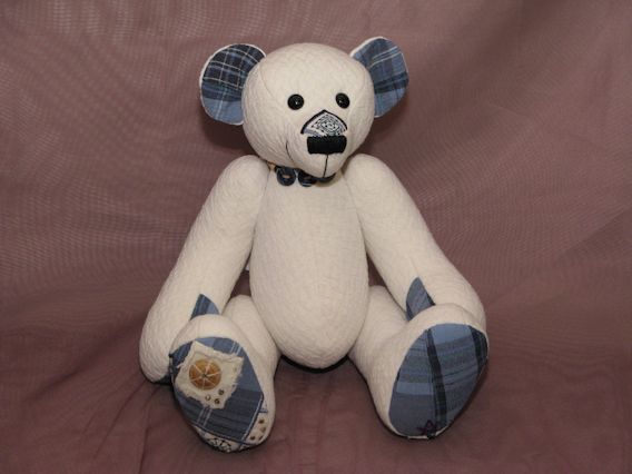 Grandma Helen is a special teddy bear made from Helen's knit top. The teddy is fully jointed, has an embroidered nose and is stuffed with polyester fiber. Grandma Helen wears a necklace made from the top's buttons and beads. The teddy stands 13 inches tall.