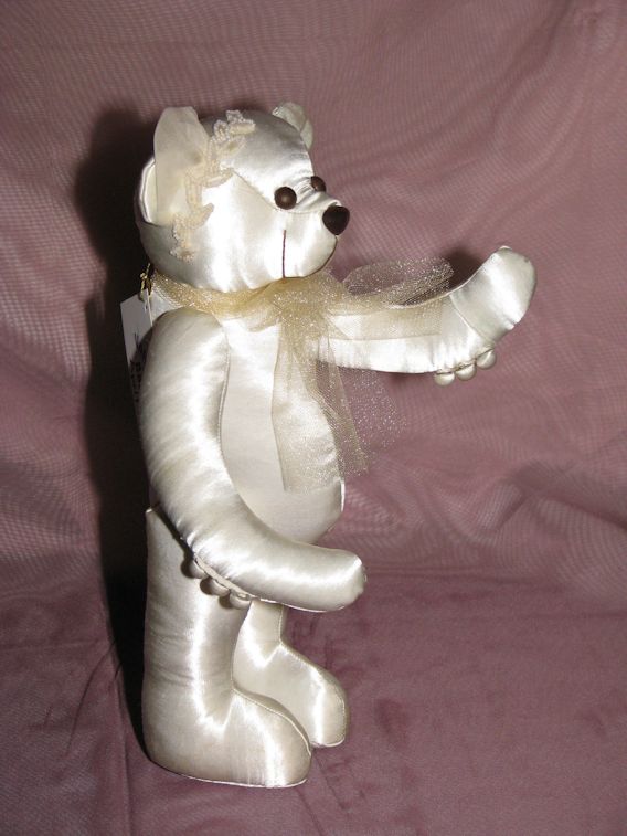 April is one of four special teddy bears made from Irene's wedding gown. The teddy is fully jointed, has leather covered eyes a flocked nose, and is stuffed with polyester fiber. The teddy's arms include loops and buttons from the back of the gown and the head is adorned with tulle and beadwork from the bodice of the gown. April is 12 inches tall.