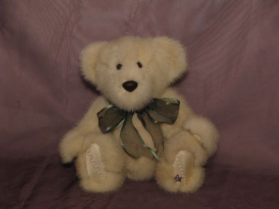 Snickerdoodle is a special teddy bear made from Pat's white mink jacket. The teddy's paw pads are made from the jacket's lining. Snickerdoodle has leather covered safety eyes and nose, is fully jointed and is stuffed with polyester fiber. The teddy is 12 inches tall.