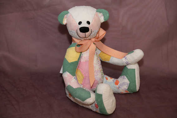 Ella is a special teddy bear made from a quilt made by Ella Montgomery. The teddy is fully jointed, has safety eye, an embroidered nose and is stuffed with polyester fiber. Ella is 14 inches tall.
