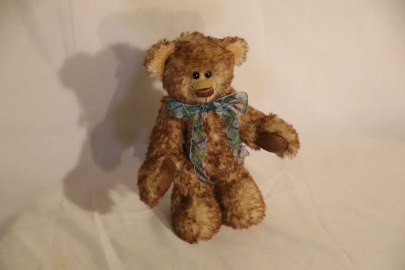Filomena is a teddy bear made from tipped mohair and has leather paw pads. The teddy has safety eyes, an embroidered nose, is fully jointed and is stuffed with polyester fiber. Filomena is 8 inches tall.