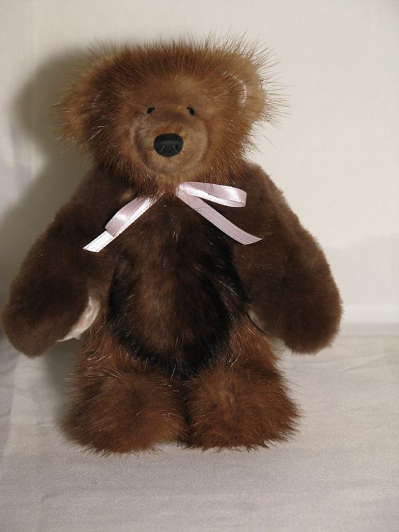 Gwen is a special teddy bear made from Gwen's fur collars and cuffs. The teddy is fully jointed, has safety eyes, and is stuffed with polyester fiber. The paw pads and inner ears are made from the lining of the collars/cuffs. Gwen is 7 inches tall.