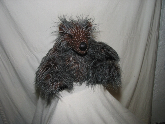 Carmine is made of long multi-colored synthetic plush. He is fully jointed and firmly stuffed with polyester fiber. He has black suedette paw pads, safety eyes and a waxed embroidered nose. Carmine is 17 inches long.