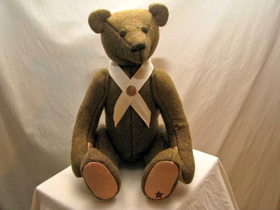 Al, Clarence and Lambert are teddy bears made from Albert Clarence Lambert's WWII Army Overcoat. The bears are fully jointed and stand 13 inches tall.