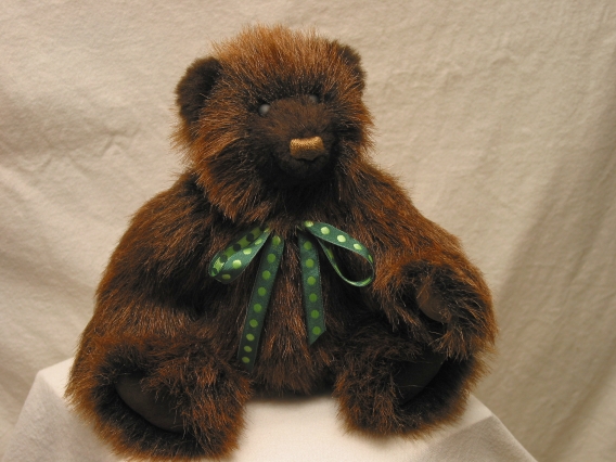 Crumpet is made from rust colored plush with dark brown ears and muzzle. He is fully jointed with suedette paw pads, matte black glass eyes, and an embroidered nose. Crumpet is 10 inches tall.
