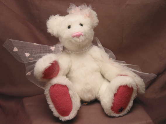 Crystal is a Valentine's bear. She is made of white synthetic plush with pink felt paw pads.