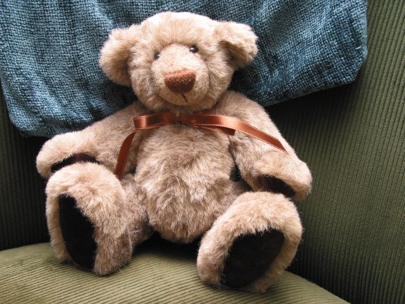 Elfin is a little charmer. He is loosely jointed and firmly stuffed with poly-fill and pellets. He is made of taupe synthetic plush with safety eyes and has an embroidered nose. His paw pads are suedette. He is 10 inches tall. |