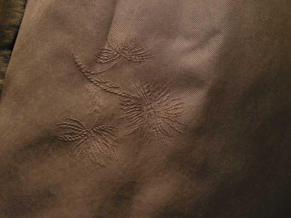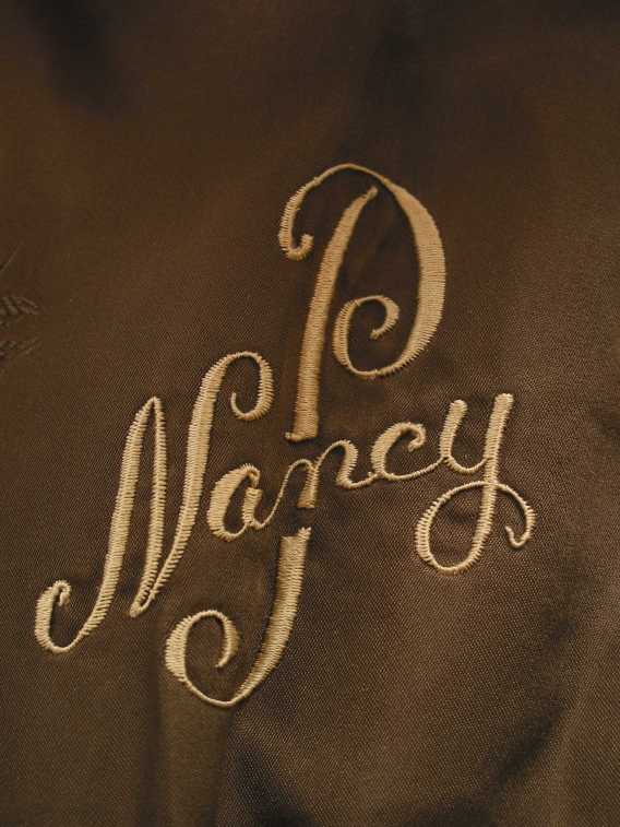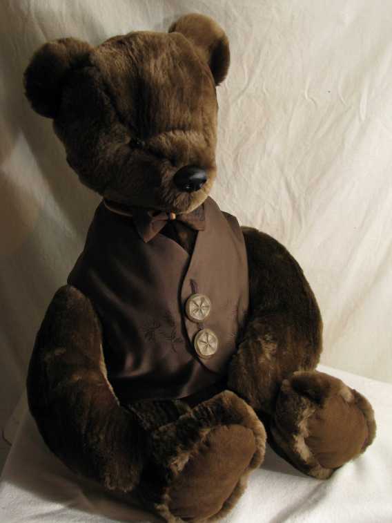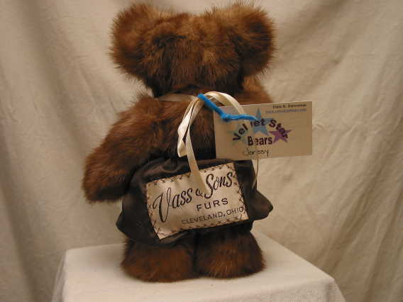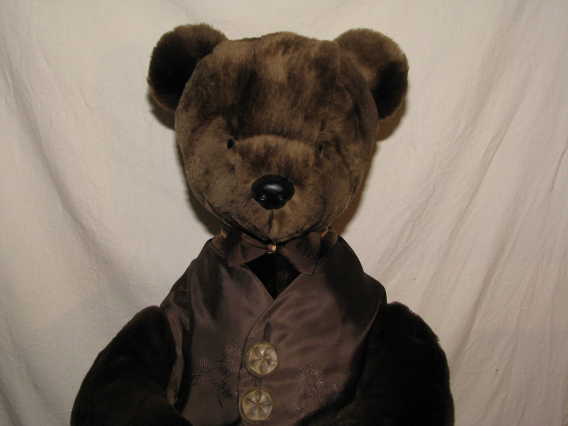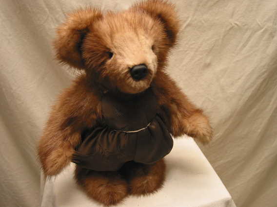Perry is made from Nancy Penney's beaver coat. His vest is made from the coat's lining and the underside of the vest includes the coat's label and mongram. Perry's bowtie is made from the coat's original lining, found in the pockets. Perry is unjointed and is 26 inches tall.