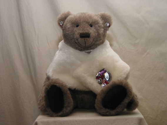 Lorna is 13 inches tall and wearing a fur stole with a brooch and earrings.
