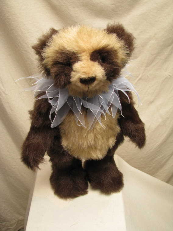 Mocha is a panda style bear made of tan and brown synthetic plush. He is fully jointed and stuffed with polyester fiber. He has safety eyes and an embroidered nose. Mocha is 13 inches tall.